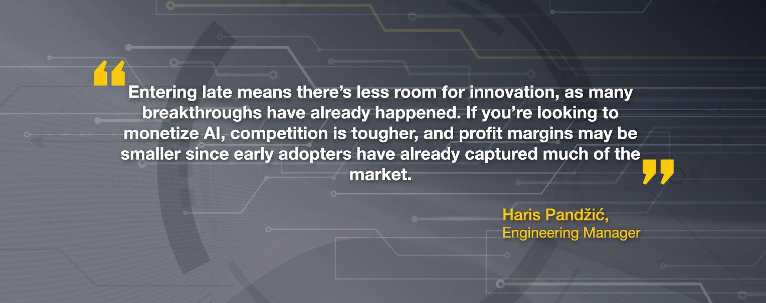 However, entering late means there's less room for innovation, as many breakthroughs have already happened. If you're looking to monetize AI, competition is tougher, and profit margins may be smaller since early adopters have already captured much of the market.