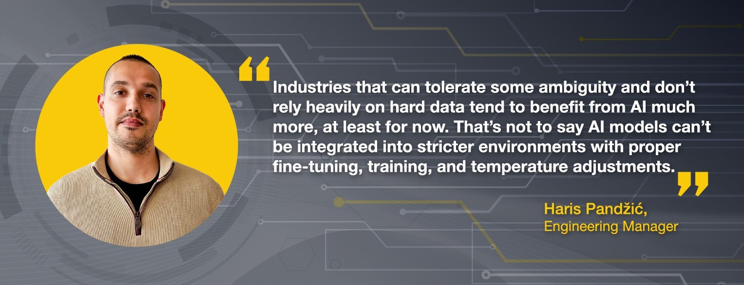 On the other hand, industries that can tolerate some ambiguity and don't rely heavily on hard data tend to benefit from AI much more, at least for now. That's not to say AI models can't be integrated into stricter environments with proper fine-tuning, training, and temperature adjustments.